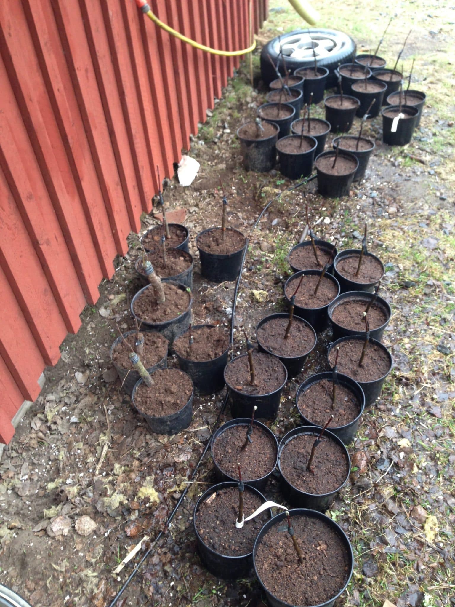 I år blev det 15 småväxta äppelträd(B9) och 15 storvuxna (A2) samt en handfull plommonträd på grova grundstammar. Reine Claud d´oullince och Victoria blev det. Nu får vi se hur många som tar sig. De är krukade och står välvattnade i skuggan på norrsidan av huset, minskad risk för uttorkning.