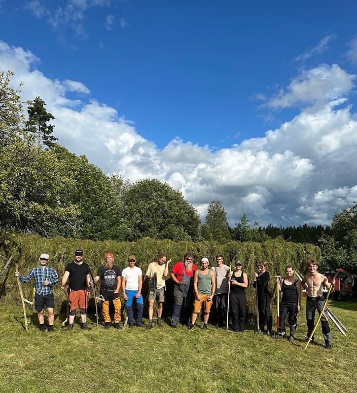 Juli och Augusti är de stora slåttermånaderna. På lördagen slår vi med lie och du lär dig hur den skall ställas in, användas och hållas vass. Vi använder sk knackeliar. Söndagen vigs åt hässjning och mer slåtter. Tillsyn av odlingarna. Boka in även reservhelgen då slåtterhelgen är mycket väderberoende och kan flyttas.
